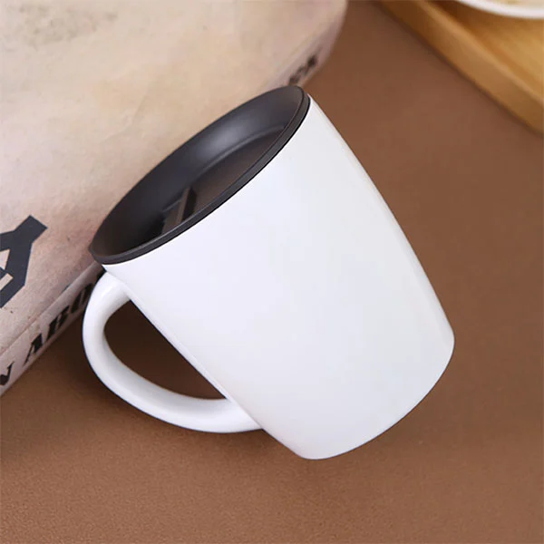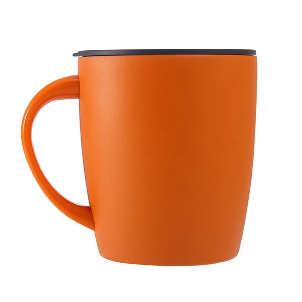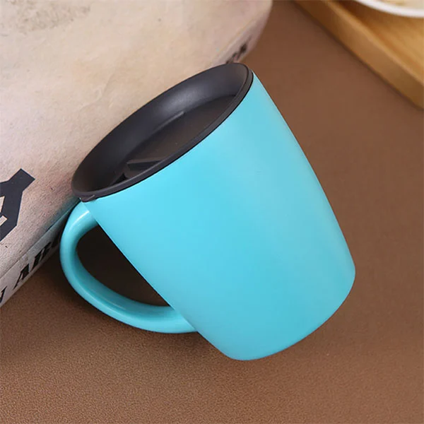 Dit is een trend ogende roestvrijstalen koffiemok met deksel, afgerond uiterlijk, laat je een goed humeur houden, op tafel geplaatst, is ook een kunstwerk.