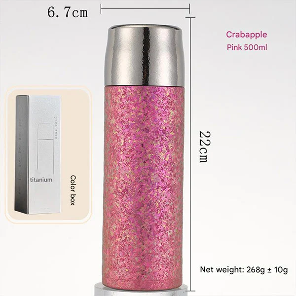 Titanium-waterflessen hebben een dubbellaags vacuümisolatieontwerp. Het is bewezen dat onze metalen waterflessen de beste isolatie bieden voor uw drankjes, of het nu om gekoelde cola of warme koffie gaat. Warme dranken kunnen tot 8 uur warm worden gehouden, terwijl koude dranken tot 12 uur warm kunnen worden gehouden. (Experimentele gegevens: Isolatie: Voeg water toe bij kamertemperatuur van 99 ° C, en de temperatuur zal na 6 uur isolatie hoger zijn dan 60 ° C; Koeling: Voeg water toe bij kamertemperatuur van 0 ° C, en de temperatuur zal na 6 uur isolatie lager zijn dan 5 ° C.)